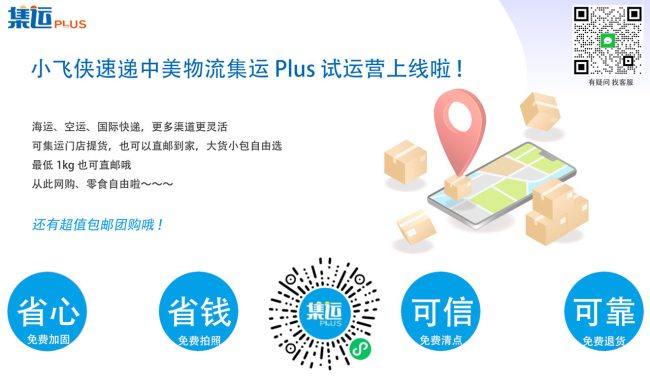 小飞侠速递中美物流集运PLUS试运营上线啦 海运、空运、国际快递,更多渠道更灵活 可集运门店提货,也可以直邮到家,大货小包自由选 最低1KG 也可直邮哦 从此网购、零食自由啦~~~ 还有超值包邮团购哦! 让…